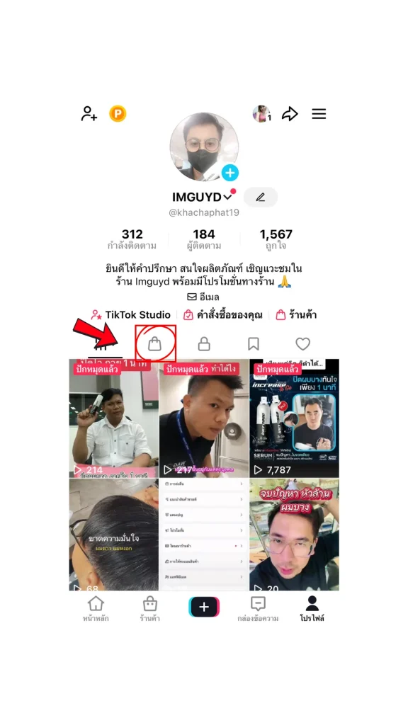 ขั้นตอนที่ 1 เมื่อค้นหาร้าน imgyd เจอเปิดหน้าโปร์ไฟล์ Tiktok กดตรงรูป ตะกร้าสินค้า