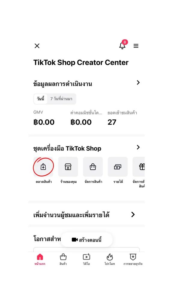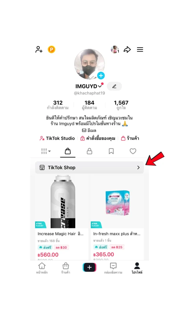 ขั้นตอนที่ 2 กดตรงคำว่า Tiktok Shop ( ลูกศร )